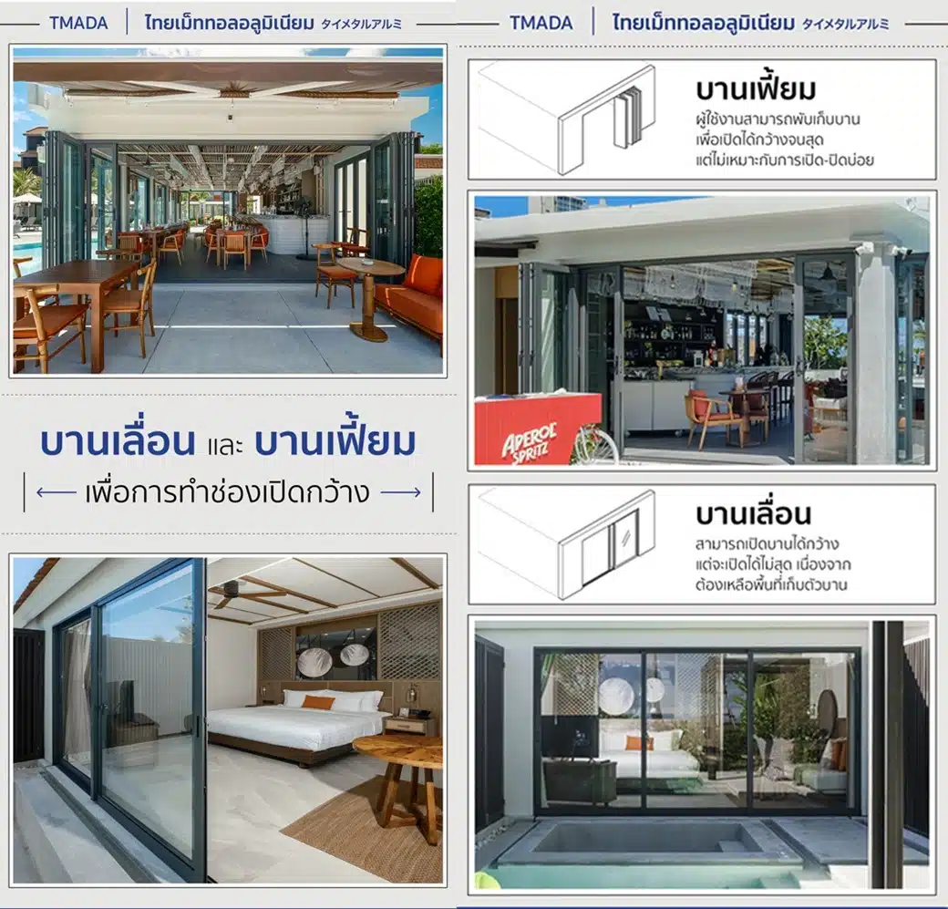 ปัจจุบันที่เน้นการออกแบบอาคารเพื่อเปิดรับบรรยากาศจากภายนอก ผู้ออกแบบสามารถเลือกใช้บานอลูมิเนียมอย่าง ‘บานเลื่อนหรือบานเฟี้ยม’ ที่ช่วยสร้างช่องเปิดที่กว้างกว่าบานรูปแบบอื่นๆ ได้ เพื่อเปิดรับอากาศและวิวได้อย่างเต็มที่