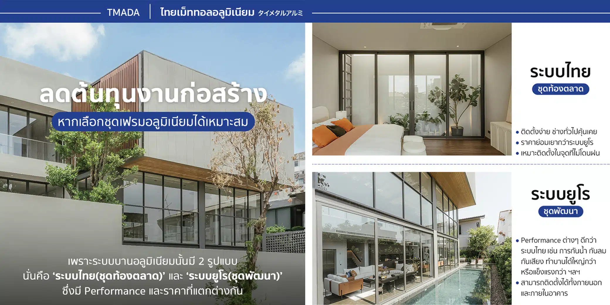 นักออกแบบหลายคนอาจจะยังไม่รู้ว่า ระบบบานอลูมิเนียมที่เราเห็นกันอยู่นั้น ไม่ได้มีระบบบานอลูมิเนียมแบบเดียว โดยจะมีหลักๆ สองแบบใหญ่ๆ คือ ระบบไทย (หรือหลายคนอาจเรียกชุดท้องตลาด) และ ระบบยูโร (หรือที่รู้จักกันอีกชื่อในไทยเม็ททอลของเราคือ ระบบพัฒนา) ที่สามารถส่งผลต่องบประมาณงานก่อสร้างได้ หากเราเลือกได้เหมาะสมหรือไม่เหมาะสมต่อการใช้งาน