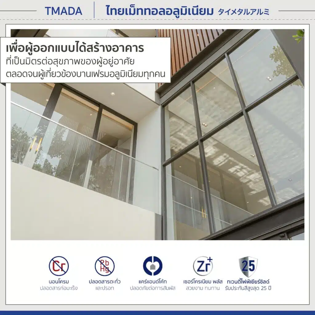 ซึ่งผู้ออกแบบคนใดที่ทราบถึงความอันตรายของสารตกค้างในอลูมิเนียม และมองหาระบบอลูมิเนียมที่ไร้สารก่อมะเร็ง ก็สามารถเลือกใช้อลูมิเนียมจาก ‘ไทยเม็ททอล’ เพราะไทยเม็ททอลมีประสบการณ์การผลิตอลูมิเนียมมาอย่างยาวนาน และรับรู้ถึงสารอันตรายต่างๆ ที่ตกค้างในอลูมิเนียม เราจึงได้ใช้นวัตกรรมการผลิตที่ปลอดสารก่อมะเร็งอย่าง ‘เซอร์โคเนียมพลัส’ ซึ่งปลอดภัย มาทดแทนการใช้ ‘โครเมียม’ รวมไปถึงยังปราศจากโลหะหนักก่อมะเร็งอื่นๆ ด้วย ไม่ว่าจะเป็น ปรอทและตะกั่ว