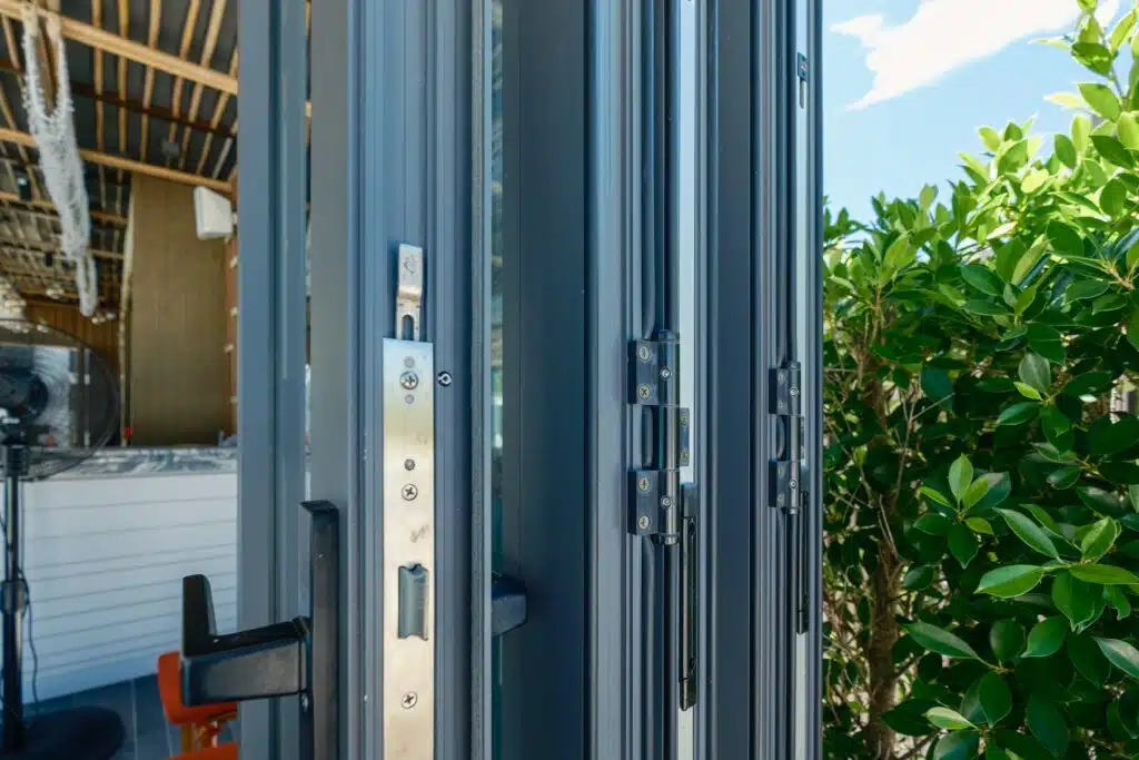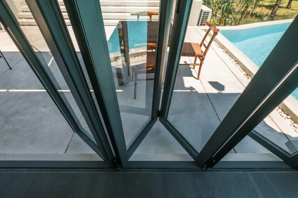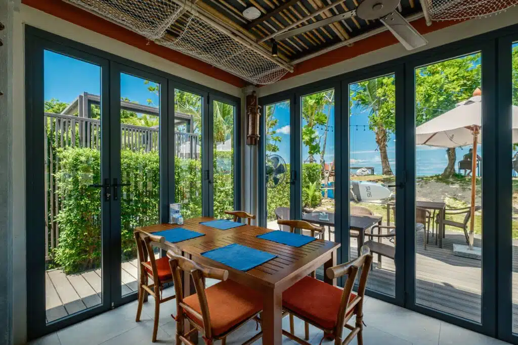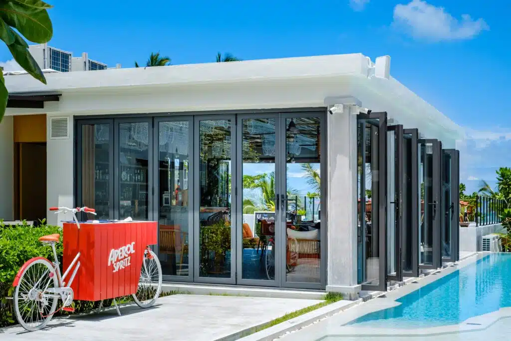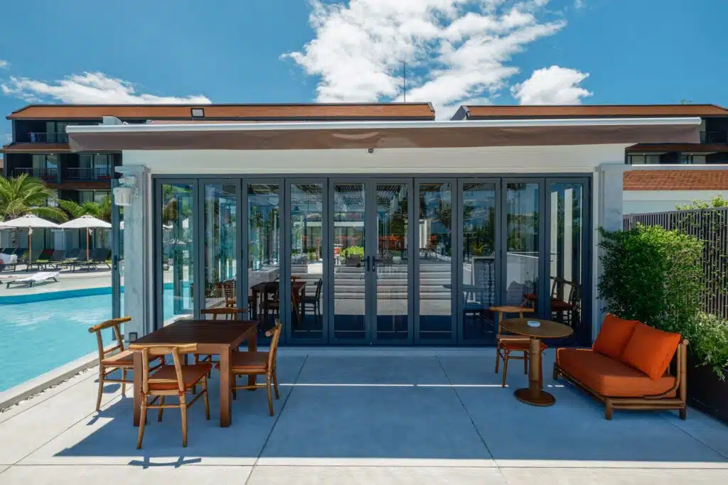 พื้นที่ส่วนกลางของโรงแรม ทาง U Samui ต้องการให้รับวิวได้เต็มที่ จึงเลือกใช้ประตูบานเฟี้ยม F40 จากไทยเม็ททอล ซึ่งเป็นอีกหนึ่งรูปแบบประตูที่สะดวกต่อการใช้งาน สามารถพับเปิด-ปิดได้อย่างอิสระและกว้างขวาง ทำให้มีอากาศถ่ายเทอย่างทั่วถึง และยังรองรับการใช้งานที่หลากหลาย โดยระบบของบานเฟี้ยมที่เลือกติดตั้งจะเป็นแบบรางฝังพื้น เพื่อป้องกันไม่ให้เดินสะดุด