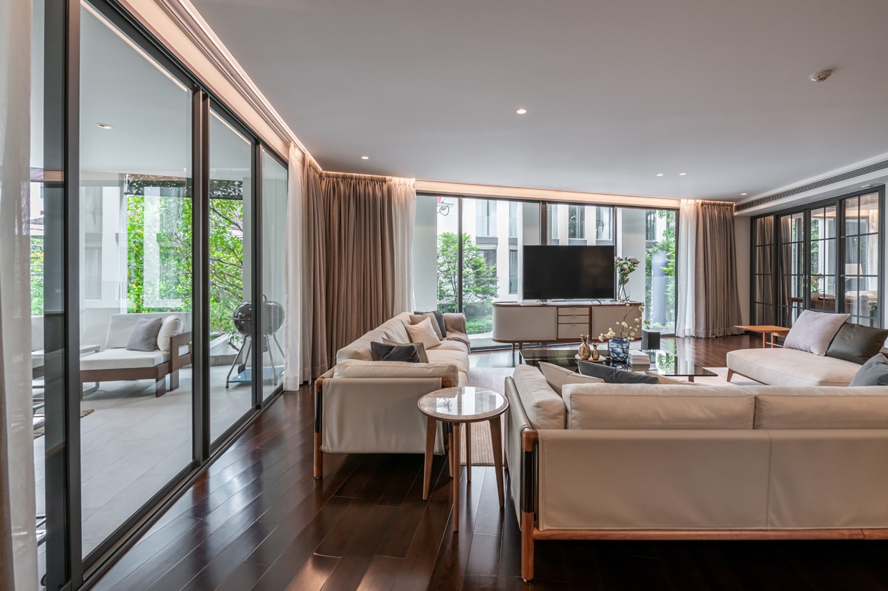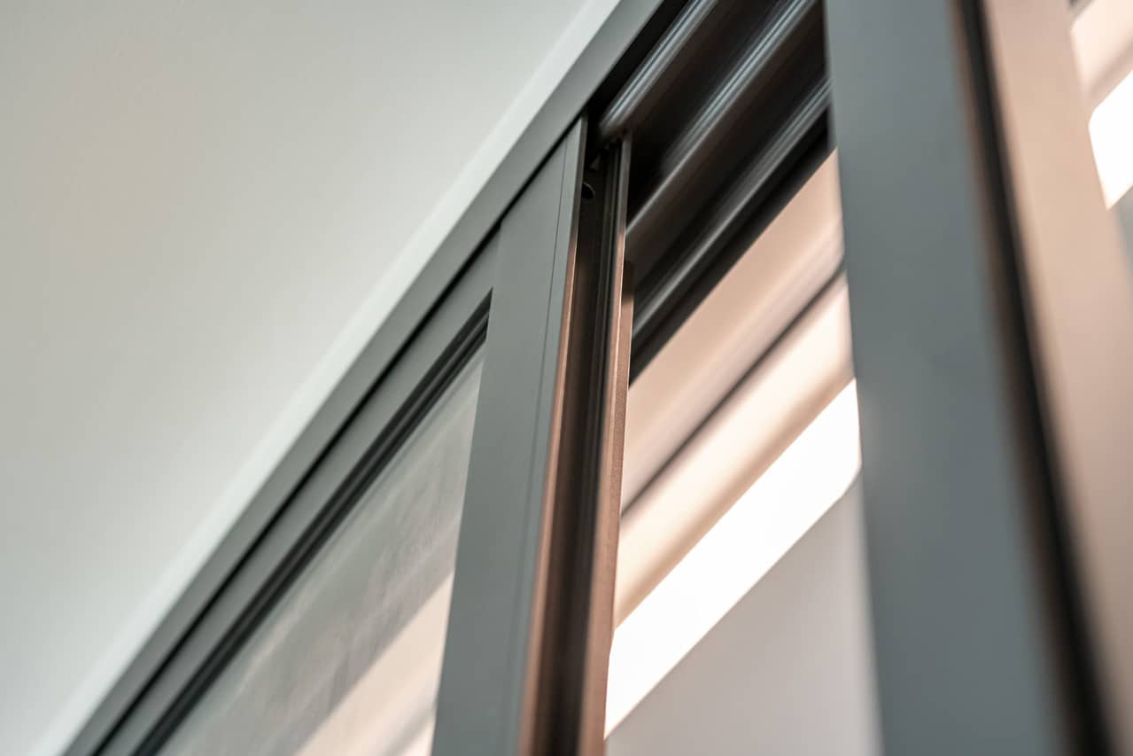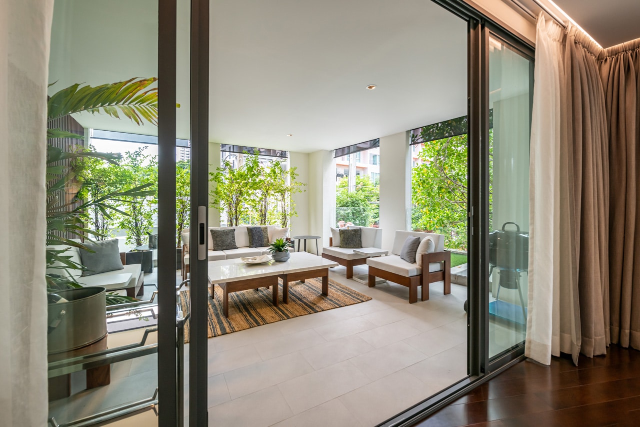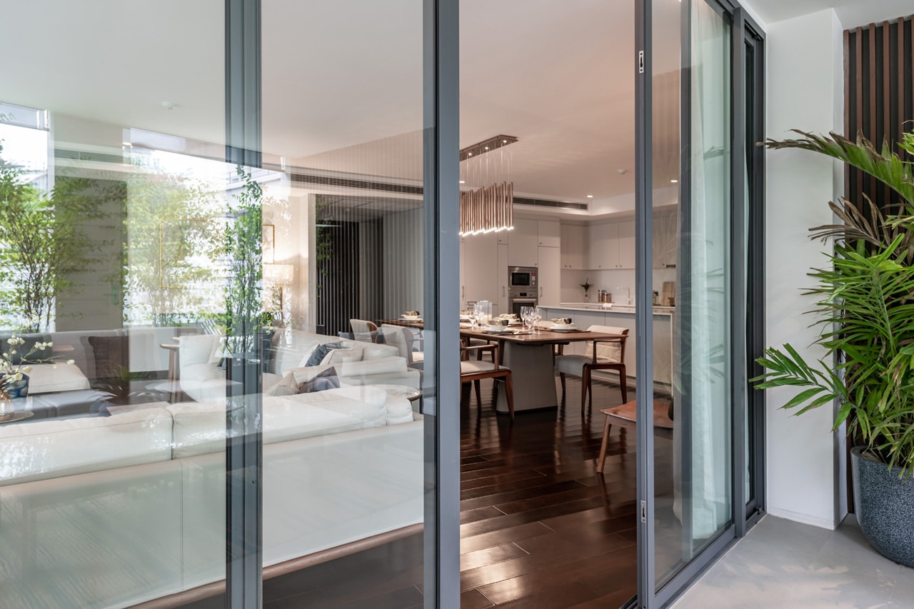 ในจุดที่ไม่ได้รับน้ำฝน ลม ฝุ่น จากภายนอก ทางโครงการเลือกติดตั้งประตูบานเลื่อนรางแขวนจากไทยเม็ททอล เพื่อแบ่งพื้นที่ภายใน โดยบานเลื่อนรางแขวนจะไม่มีธรณีประตู ซึ่งเหมาะกับพื้นที่ดังกล่าวที่มีคนเข้า-ออกบ่อยๆ จึงไม่ต้องกังวลกับปัญหาเดินสะดุด