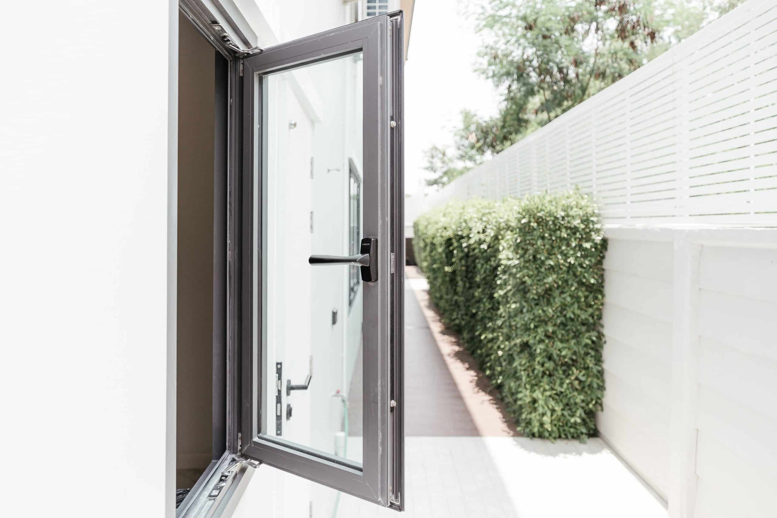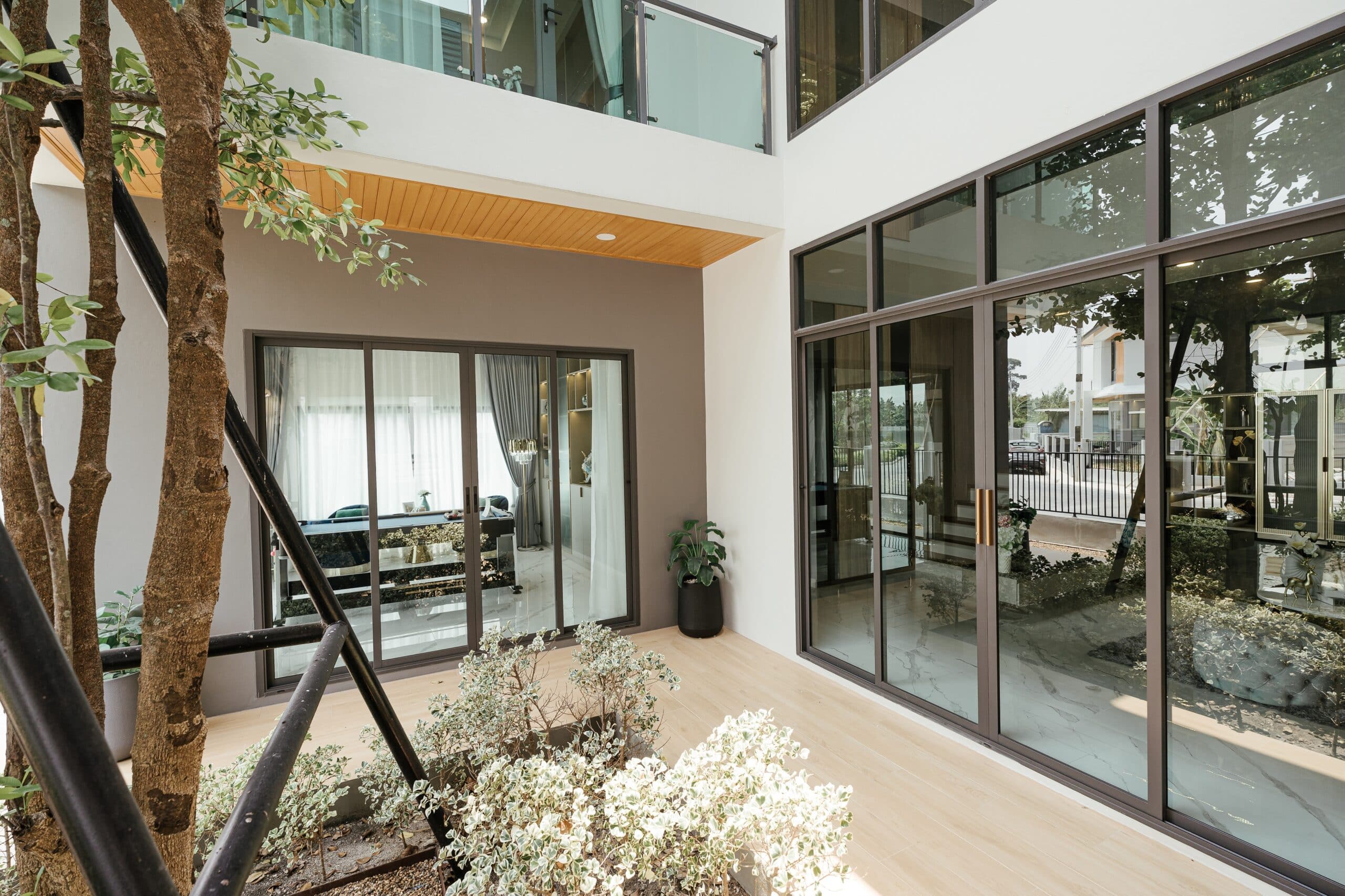 แต่ละมุมของบ้านจะมีความโดดเด่นแตกต่างกัน ประตูบานเปิดกรอบเฟรมอลูมิเนียมสีเทา Sahara Grey ตัวบานเป็นกระจกเพื่อให้ผู้อยู่อาศัยรู้สึกเป็นส่วนหนึ่งกับธรรมชาติข้างนอก สามารถเปิดรับลม พร้อมทั้งช่วยให้อากาศถ่ายเทได้อย่างดี