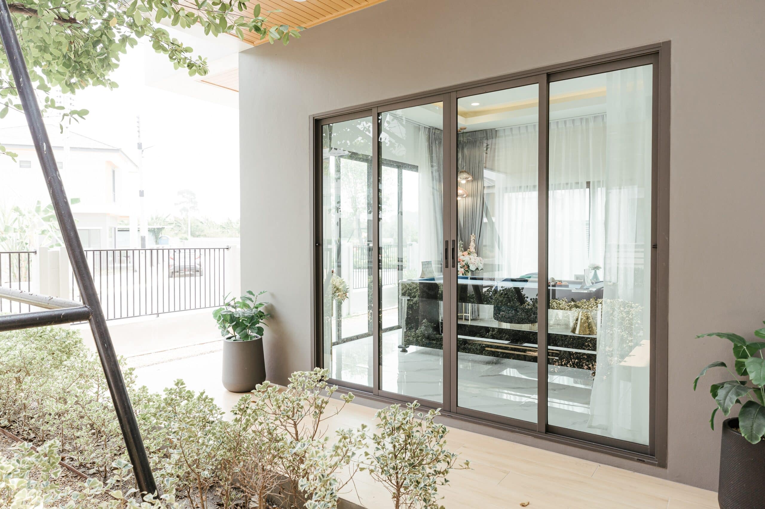 บริเวณทางเข้าบ้านชั้นล่างเลือกใช้ ประตูบานเลื่อนกึ่งยูโร รุ่น X10 แบ่ง 4 บาน พร้อมบานช่องแสง ที่สามารถเปิดทุกบานออกมารับลมธรรมชาติได้อย่างลงตัว มอบบรรยากาศแห่งความผ่อนคลาย อยู่สบาย ปลอดภัย ให้ผู้อยู่อาศัยไม่ต้องกังวลกับปัญหาน้ำรั่วซึมเข้าบริเวณบ้าน ด้วยคุณสมบัติที่มีรางล่างแบบกันน้ำ กันเสียง กันฝุ่นละออง และกันแมลงที่จะลอดเข้าช่องระหว่างบาน หรือสิ่งรบกวนจากภายนอกได้เป็นอย่างดี