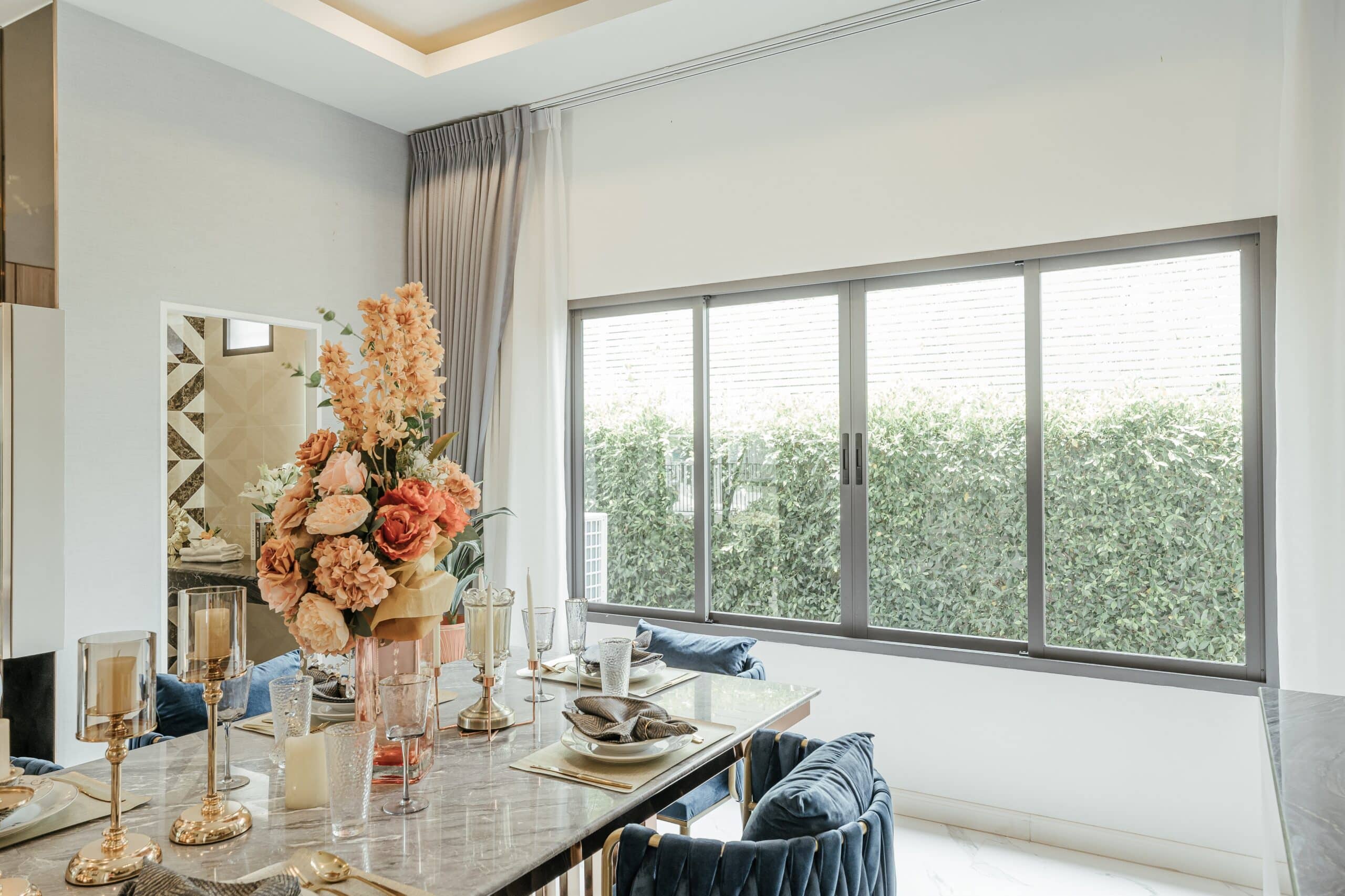 บริเวณห้องครัวและโซนรับประทานอาหารเชื่อมต่อถึงกันโดยมีหน้าต่างบานเลื่อนกึ่งยูโร รุ่น X10 กั้นแบ่งพื้นที่ให้เป็นสัดส่วน ช่วยกักเก็บอากาศ กลิ่นไม่พึงประสงค์ไม่ให้ออกมารบกวนโซนอื่นๆภายในบ้าน และยังสามารถเปิดบานออกเพื่อช่วยระบายอากาศได้ดี