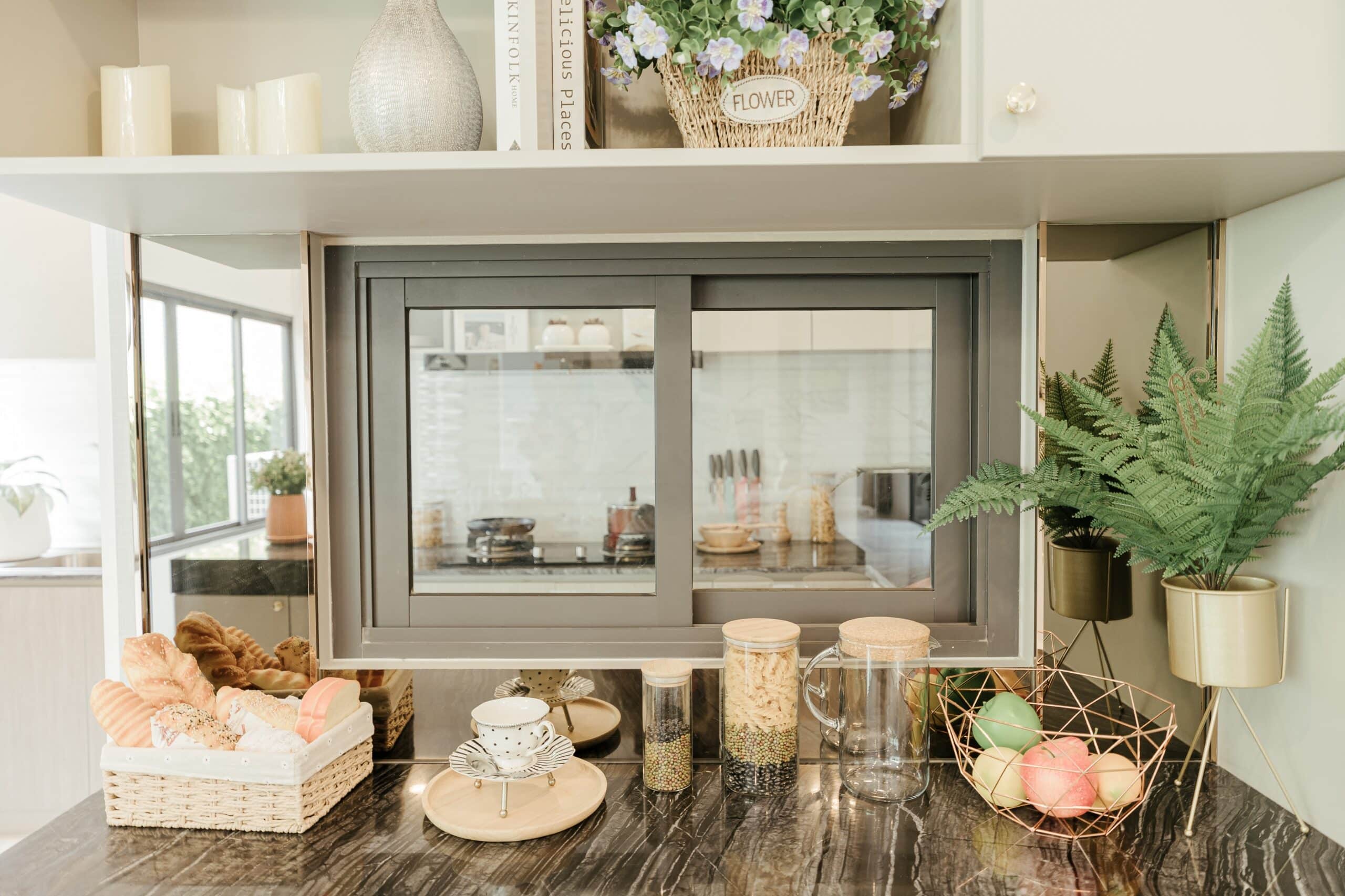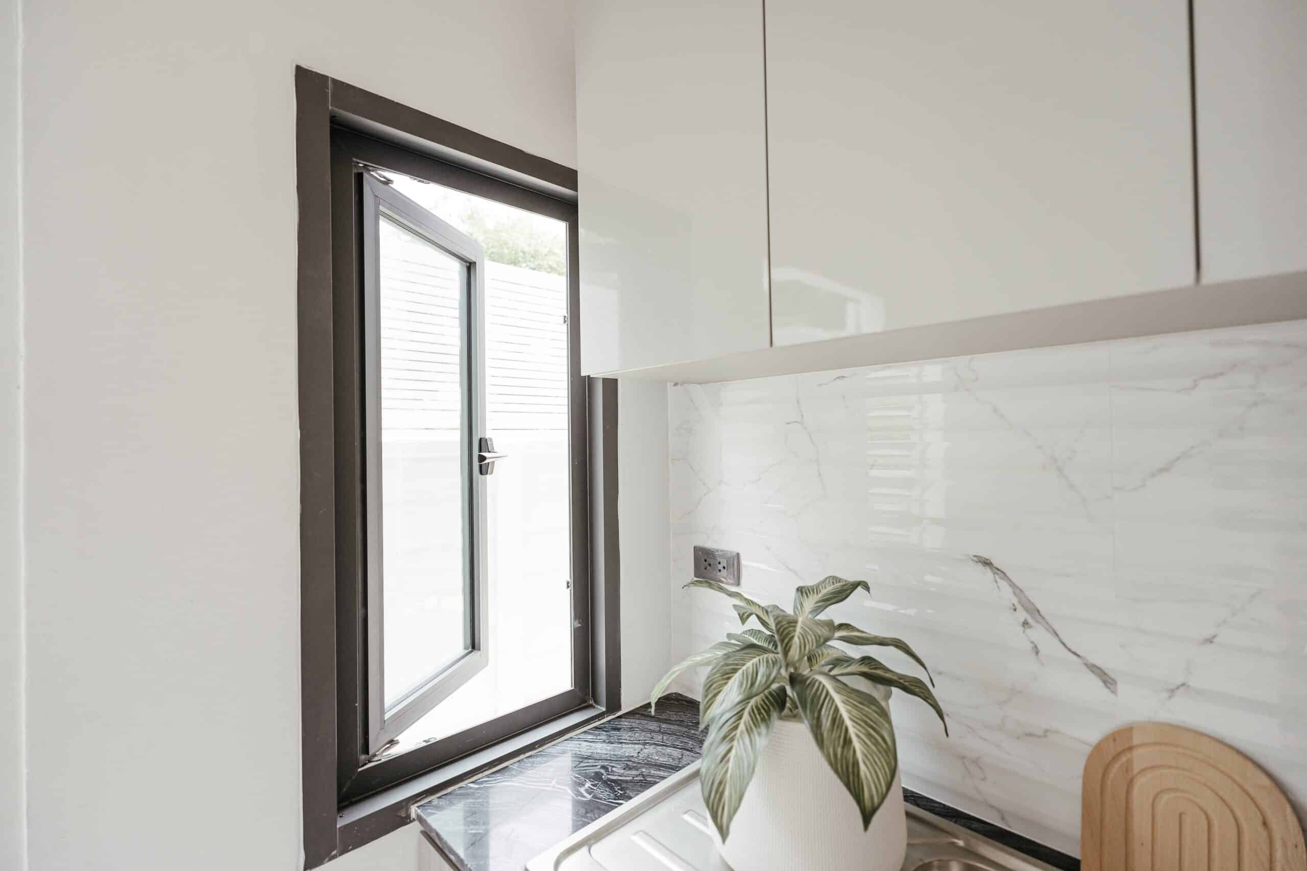 มุมสำหรับล้างจาน เลือกใช้หน้าต่างบานเปิด รุ่น A40 ซึ่งถูกออกแบบให้มีบานใหญ่ เพื่อให้บ้านได้รับแสงแดดและลมธรรมชาติ ให้มุมล้างจานดูแห้ง สะอาด พร้อมช่วยระบายอากาศ สามารถป้องกันน้ำรั่ว กันเสียง กันลม หรือสิ่งรบกวนจากภายนอกได้อย่างมีประสิทธิภาพ
