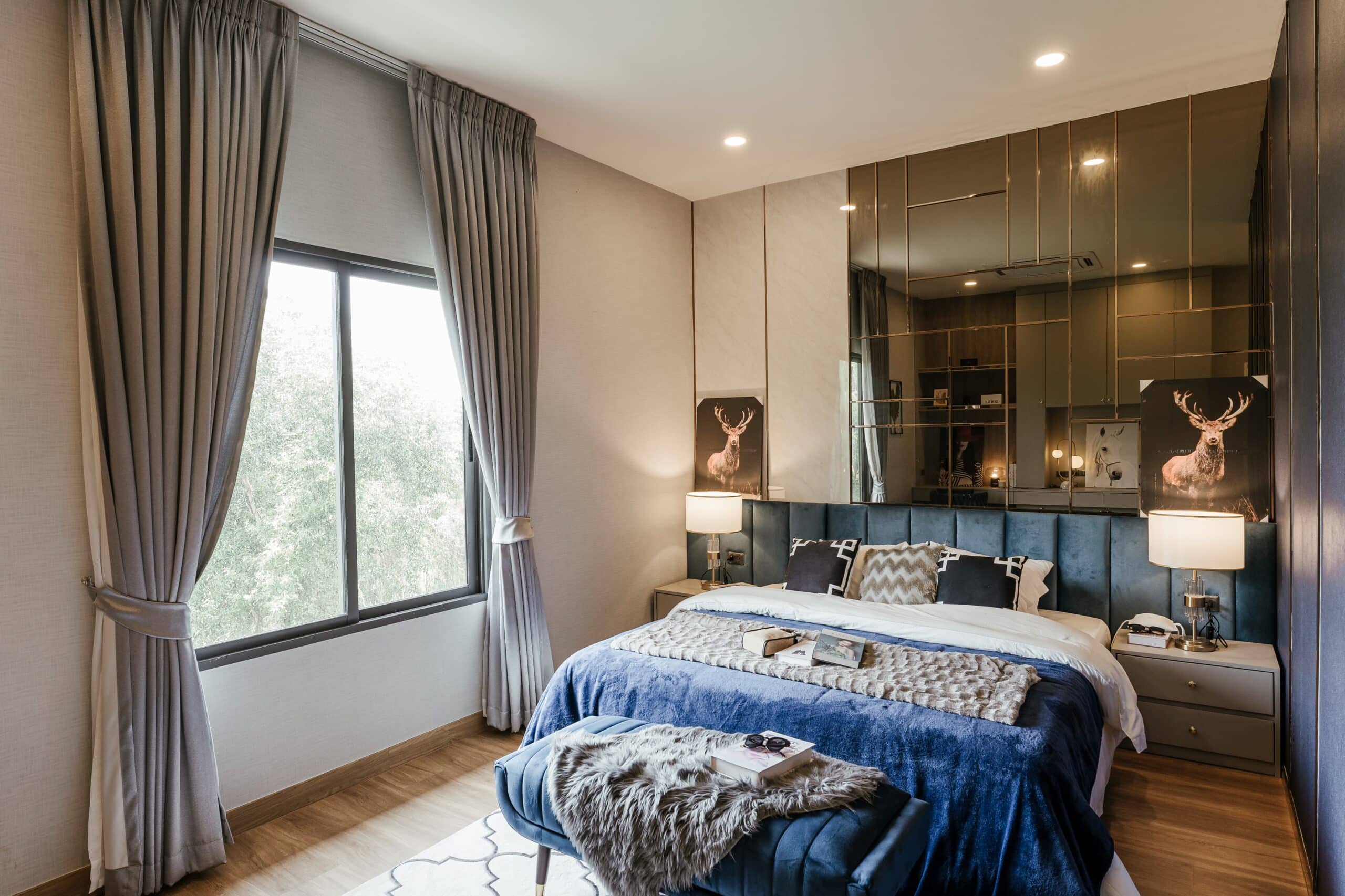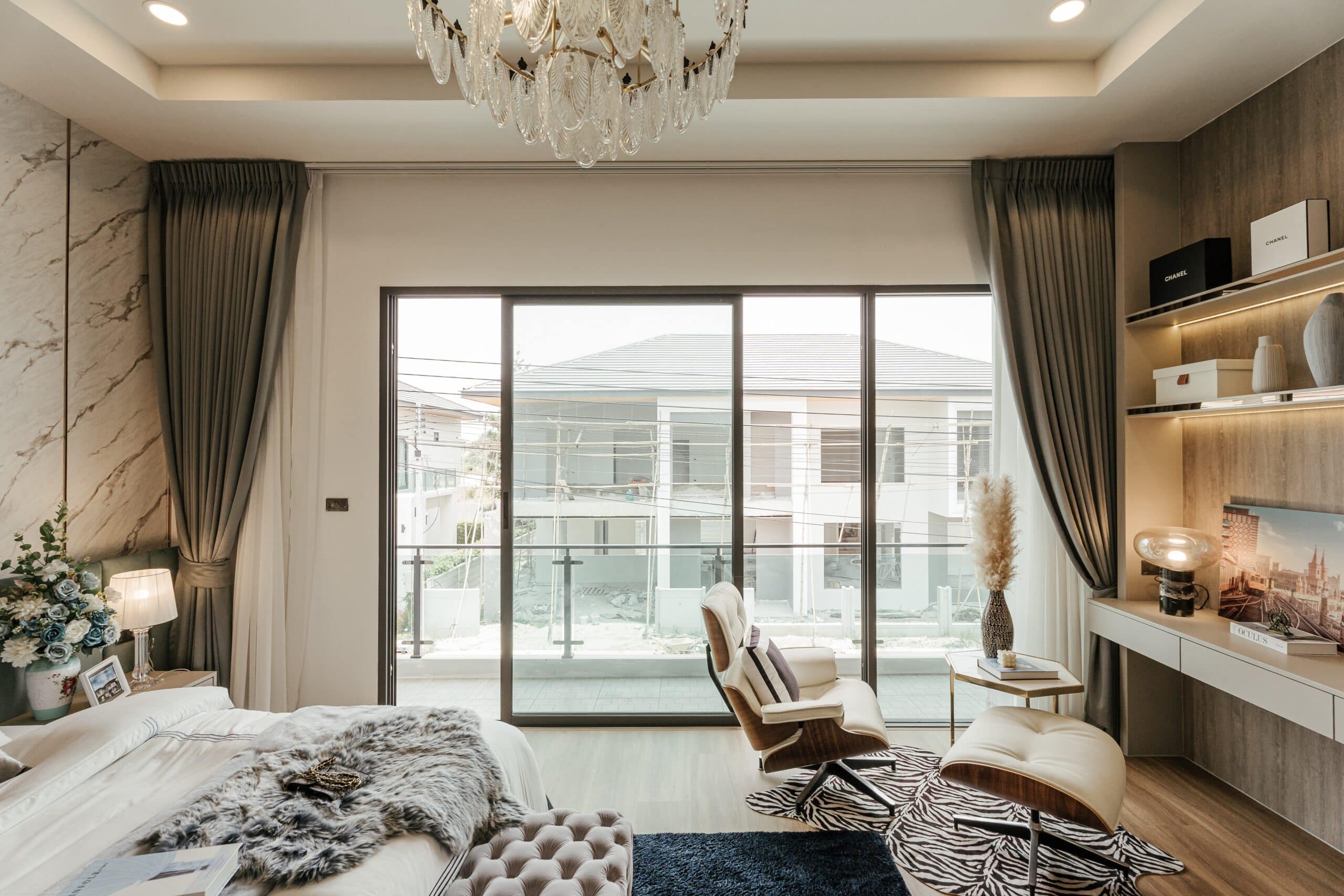 ในส่วนของห้องนอน Master Bedroom ถูกเชื่อมต่อกับระเบียงด้านนอก โครงการเลือกใช้ประตูบานเลื่อนกึ่งยูโร รุ่น X10 แบบแบ่ง 3บาน ขนาดใหญ่ เพื่อรับลมธรรมชาติและช่วยถ่ายเทอากาศได้เป็นอย่างดี พร้อมกับห้องนอนอื่นๆ ในบ้านที่เลือกใช้หน้าต่างรุ่นเดียวกัน ช่วยสร้างพื้นที่แห่งความสงบและการพักผ่อนอย่างเป็นส่วนตัว ไร้สิ่งรบกวนจากภายนอก