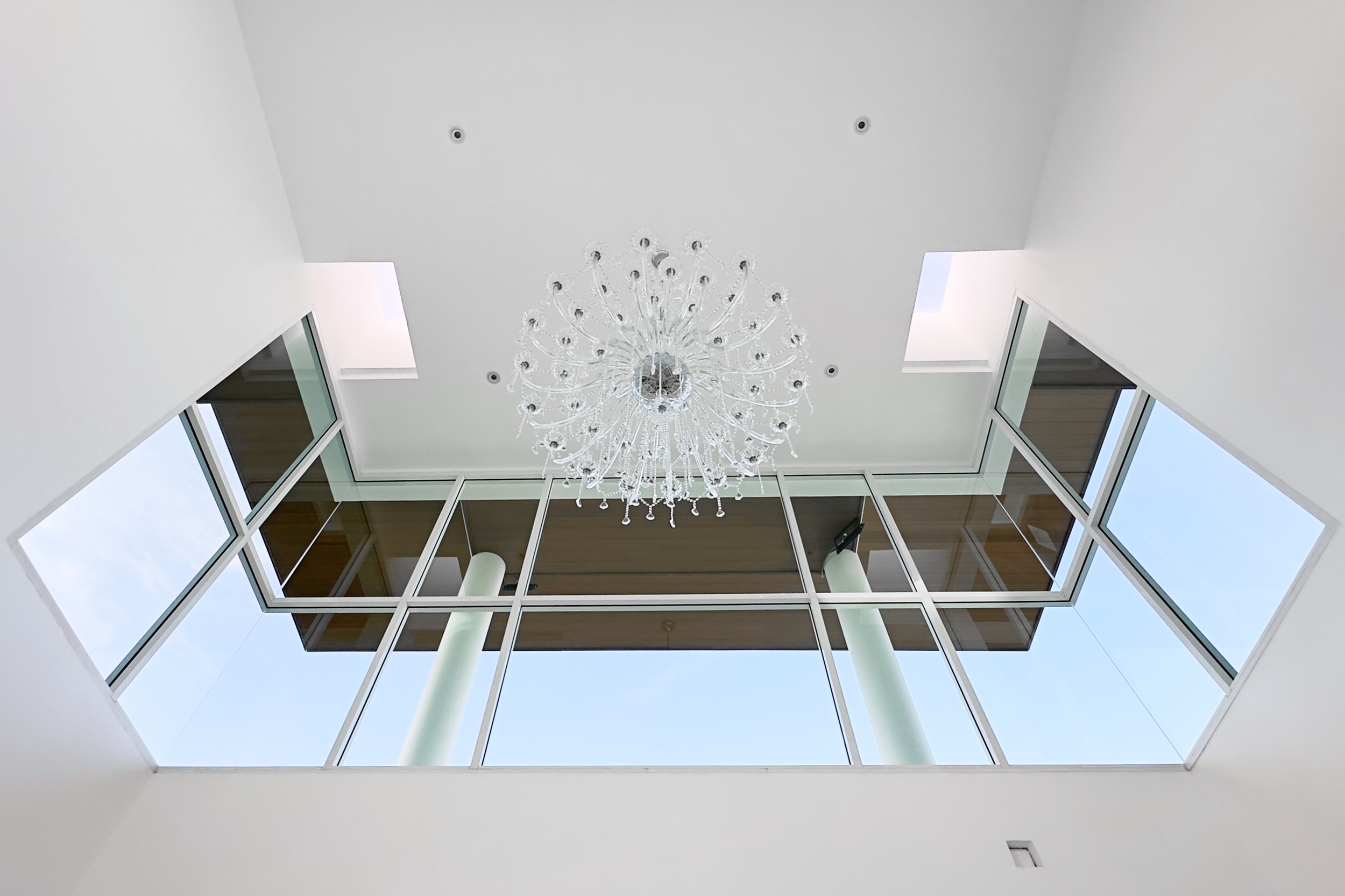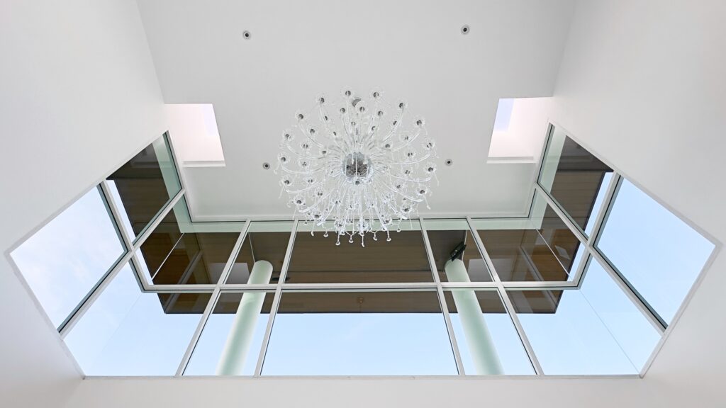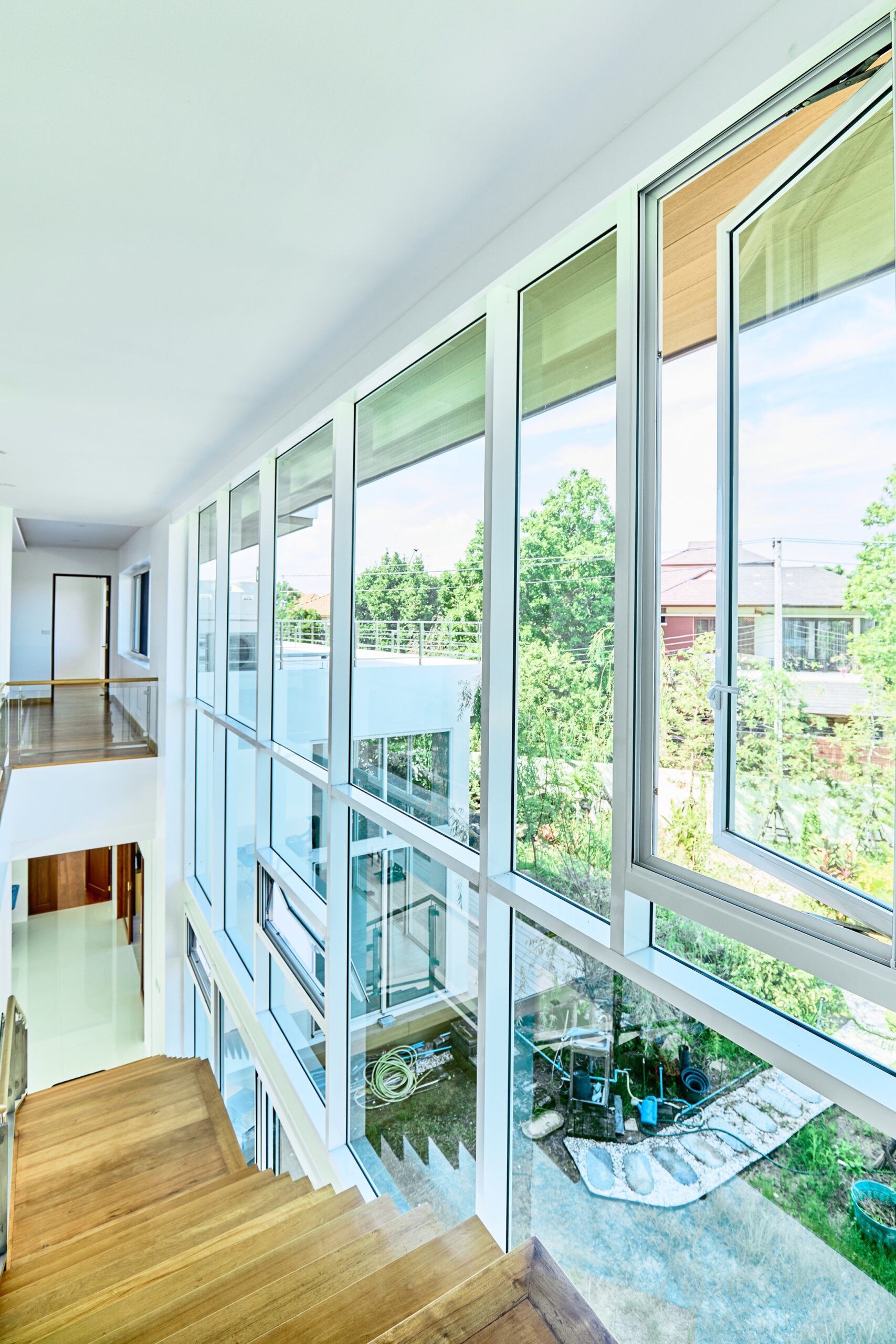 อีกหนึ่งองค์ประกอบสำคัญ คือพื้นที่โถงบันไดแบบ Double Volume ซึ่งเลือกใช้ ระบบผนังกระจกอลูมิเนียม (Curtain Wall) เพื่อเปิดมุมมองและยกระดับประสบการณ์ของพื้นที่ ถูกออกแบบให้รองรับกระจกขนาดใหญ่ทั้งความกว้างและความสูง ทำหน้าที่เชื่อมโยงพื้นที่ภายในกับภายนอกให้เป็นหนึ่งเดียวเสมือนเป็นส่วนหนึ่งของธรรมชาติ