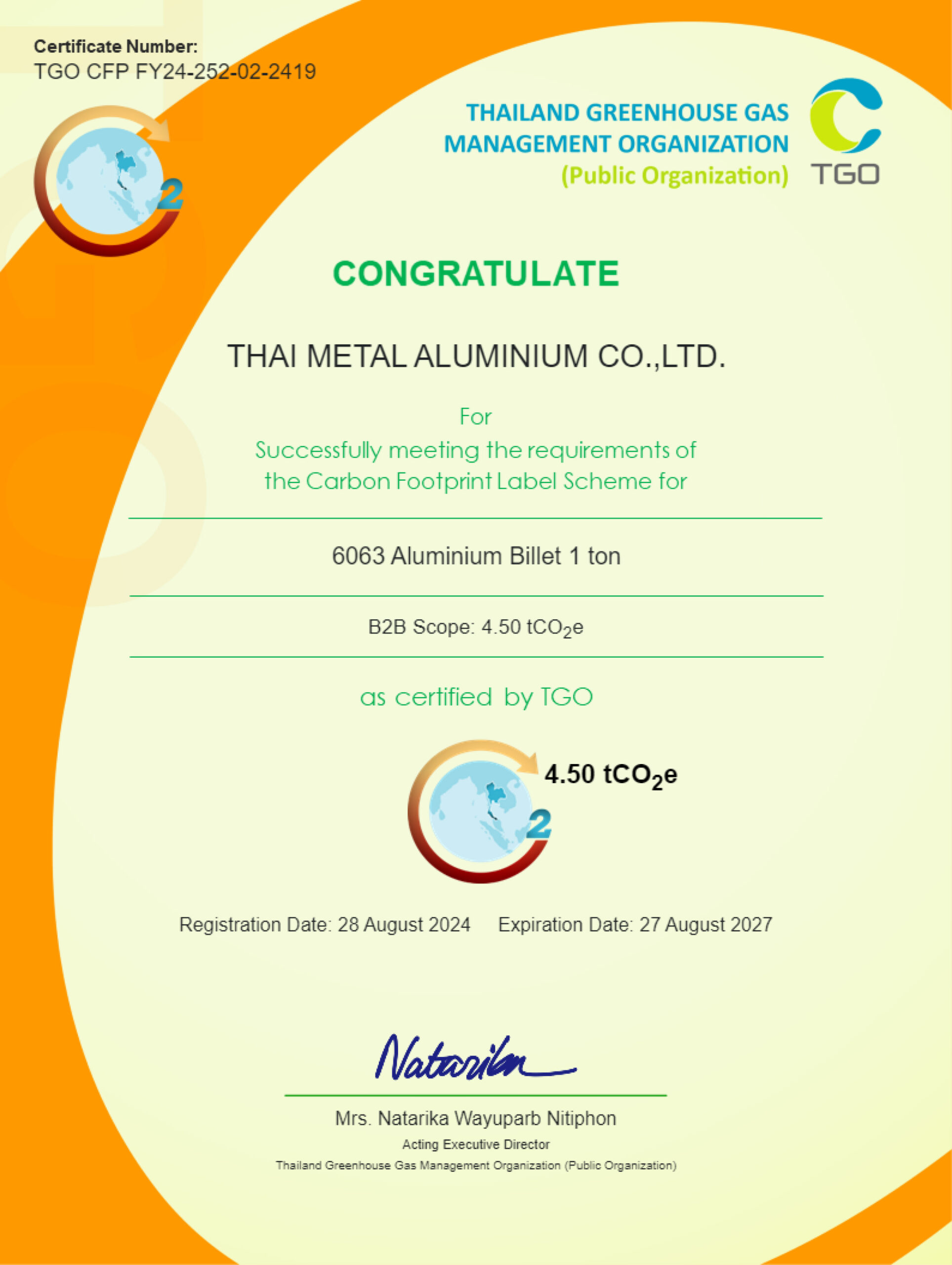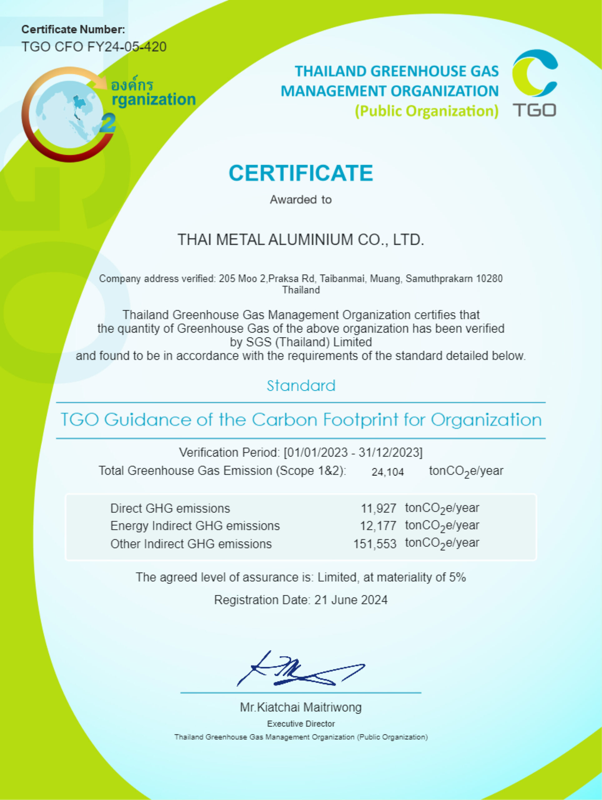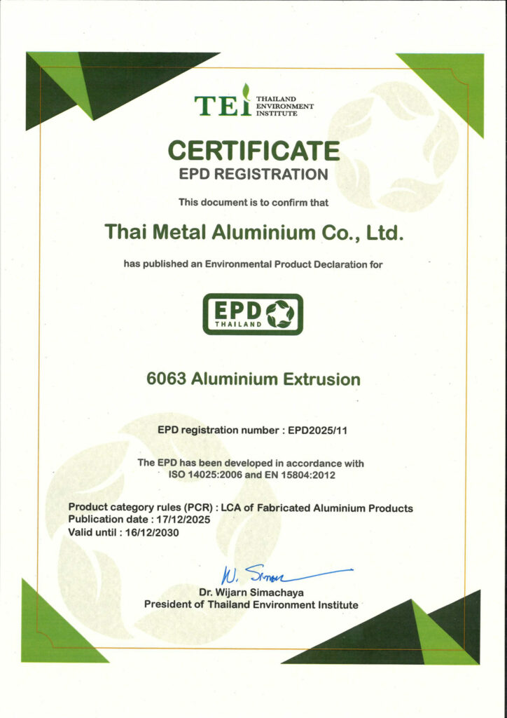 Thai Metal Aluminium ยังเป็นผู้ผลิตรายแรกในประเทศไทยที่ได้รับการรับรอง Environmental Product Declaration (EPD) รวมถึง Carbon Footprint ทั้งในระดับองค์กร (CFO) และผลิตภัณฑ์ (CFP) สะท้อนถึงความมุ่งมั่นในการพัฒนาผลิตภัณฑ์ที่มีคุณภาพ ควบคู่กับความรับผิดชอบต่อสิ่งแวดล้อมอย่างยั่งยืน