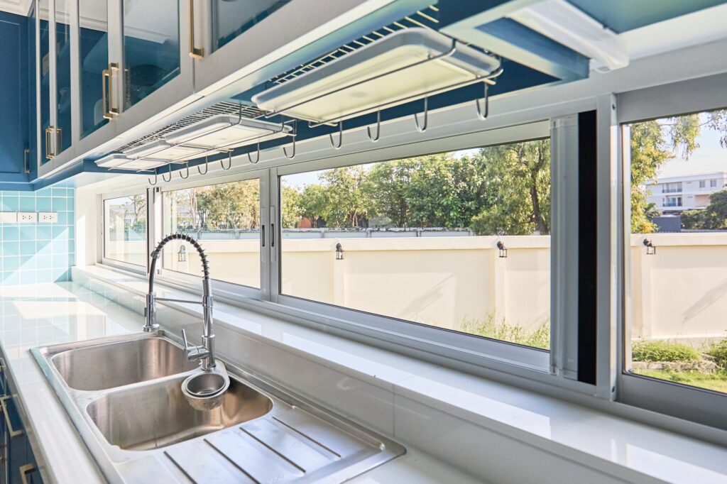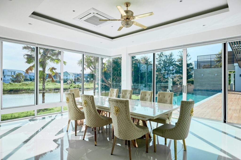 เช่นเดียวกับในพื้นที่ห้องรับประทานอาหารที่ถูกออกแบบให้เป็นจุดเชื่อมต่อระหว่างมื้ออาหารพิเศษกับบรรยากาศที่มองเห็นทะเลสาบและสระว่ายน้ำภายนอก ด้วยประตูบานเลื่อนอลูมิเนียมไทยเม็ททอล ช่วยขยายพื้นที่ให้ดูโอ่โถงและรับแสงธรรมชาติได้อย่างเต็มที่ ในขณะที่พื้นที่ห้องครัวยังคงรักษามาตรฐานความสุนทรีย์ด้วยหน้าต่างบานเลื่อนที่ออกแบบมาให้สมดุลระหว่างฟังก์ชันการระบายอากาศที่ดีและการดีไซน์ที่สม่ำเสมอเข้ากับส่วนอื่นของบ้าน
