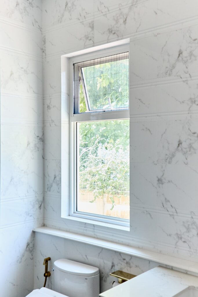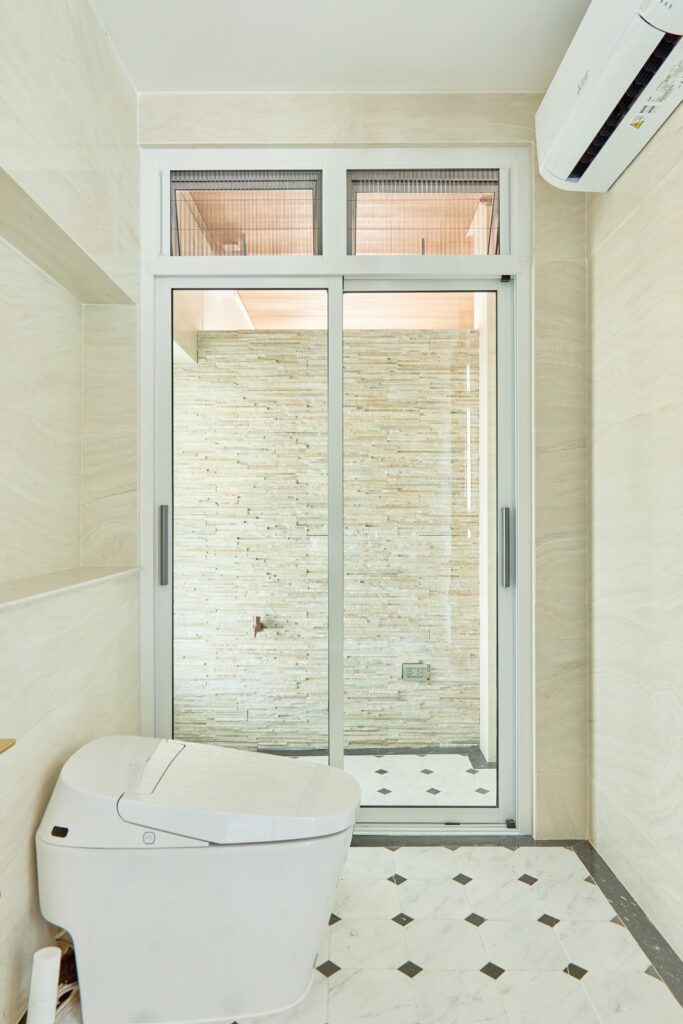 แม้แต่ในพื้นที่ที่ต้องการความเป็นส่วนตัวสูงอย่างห้องน้ำ ยังเลือกติดตั้งประตูบานเลื่อนและหน้าต่างบานกระทุ้งร่วมกับชุดช่องแสง เพื่อทำหน้าที่ป้องกันสิ่งรบกวนจากภายนอก ทั้งฝุ่นละออง แมลง และน้ำรั่วซึมได้อย่างมีประสิทธิภาพ ในขณะเดียวกันยังคงรักษาความโปร่งและการระบายอากาศที่ดี