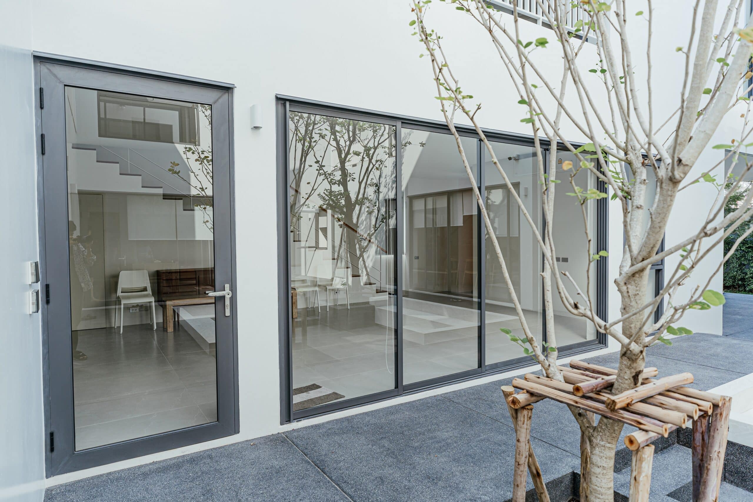 ในส่วนของประตู-หน้าต่างที่เชื่อมต่อไปยังพื้นที่สวนได้เลือกใช้ประตูหน้าต่างชุดพัฒนา X-SERIES (หรือชุดยูโร) ได้แก่ ประตูบานเลื่อนแบ่ง 4 บาน รุ่น X20 ที่ออกแบบรางล่างให้เหมาะสมกับการใช้งานภายนอก และหน้าต่างบานเปิด รุ่น A40 โดยทั้ง 2 รุ่น มีคุณสมบัติในการกันน้ำรั่วซึม กันเสียง กันฝุ่นละออง รวมถึงกันแมลง ได้ดีกว่าประตูหน้าต่าง ระบบไทยมาตรฐานทั่วไป พร้อมระบบล๊อกหลายจุด (multipoint lock) เพื่อเพิ่มความแน่นหนาของบาน กันการกระพือและการงัดแงะได้เป็นอย่างดี