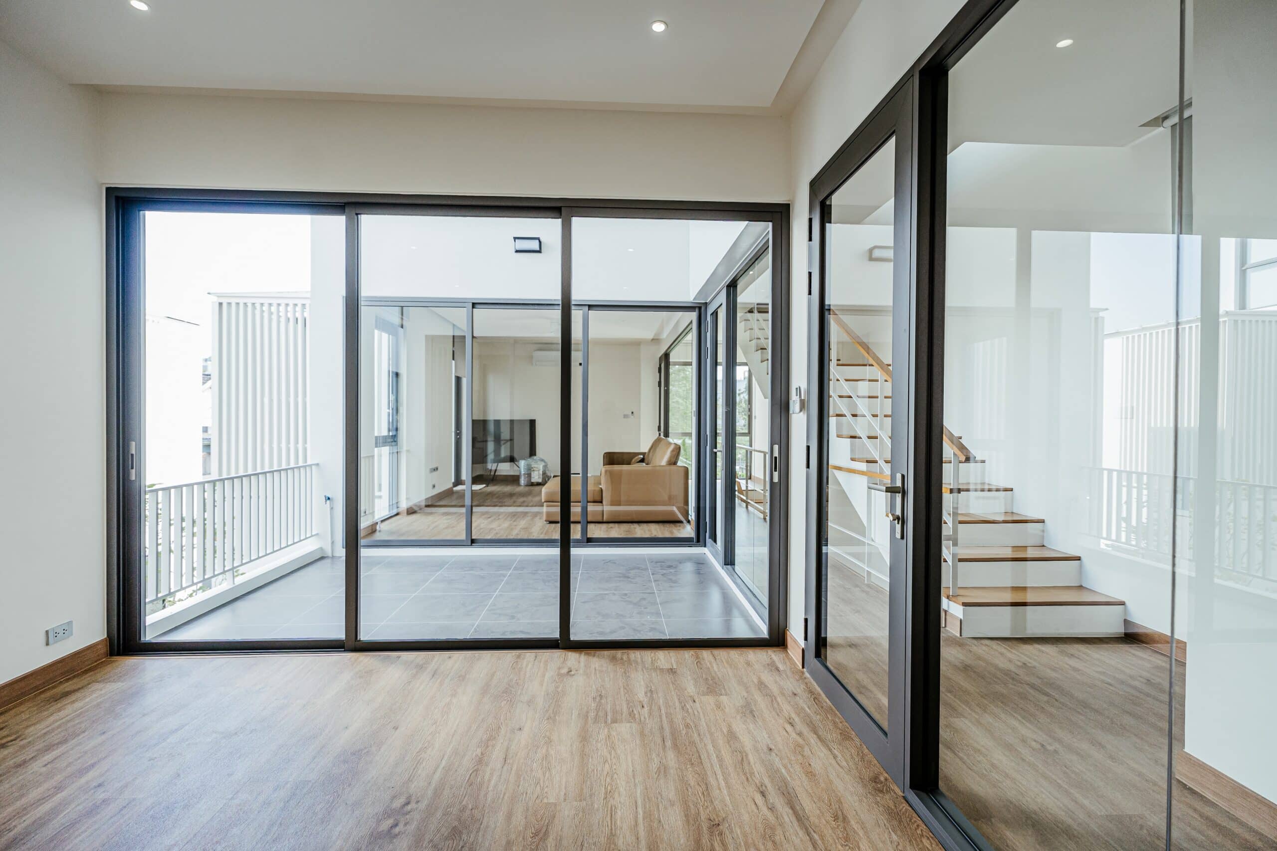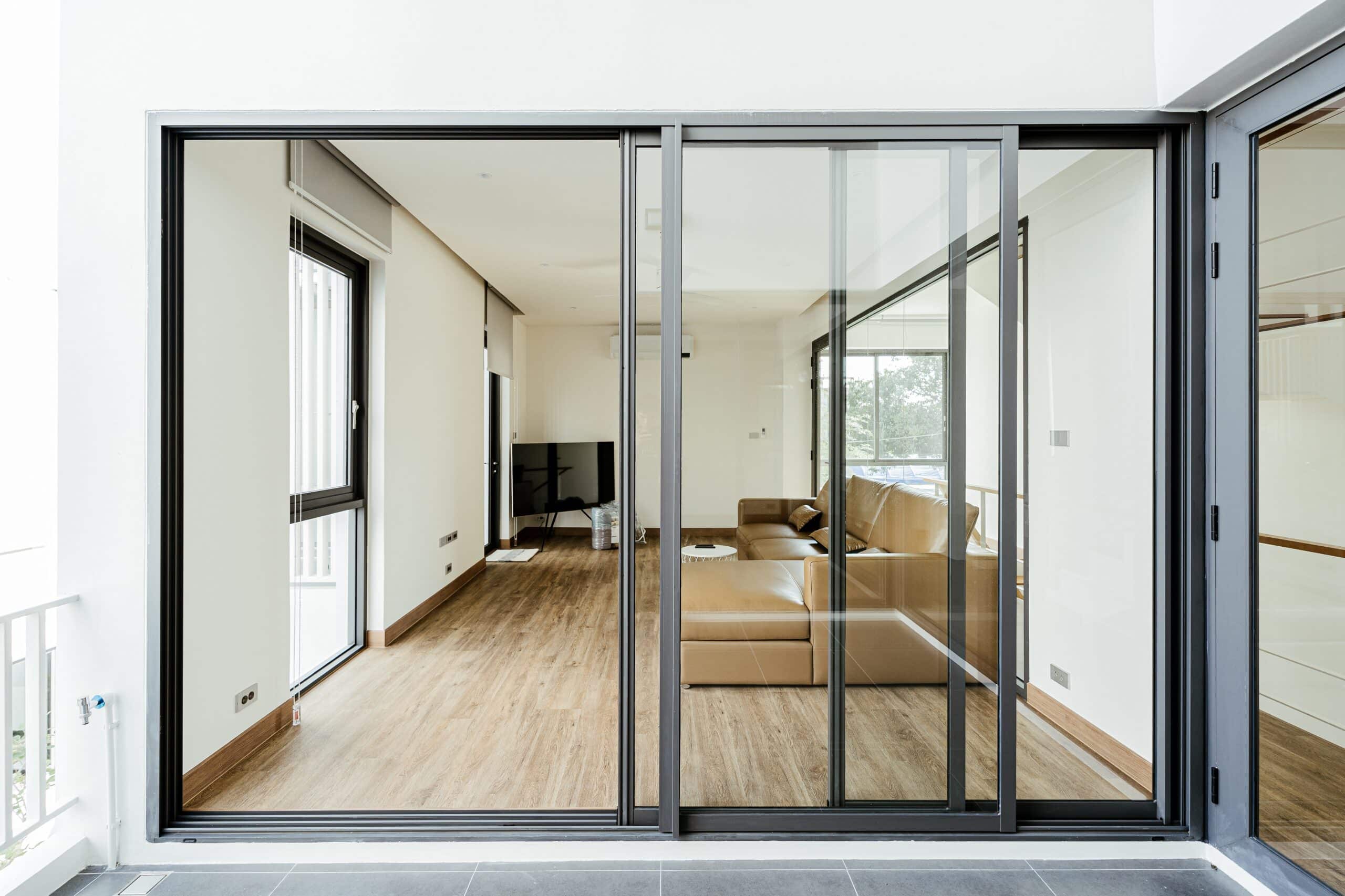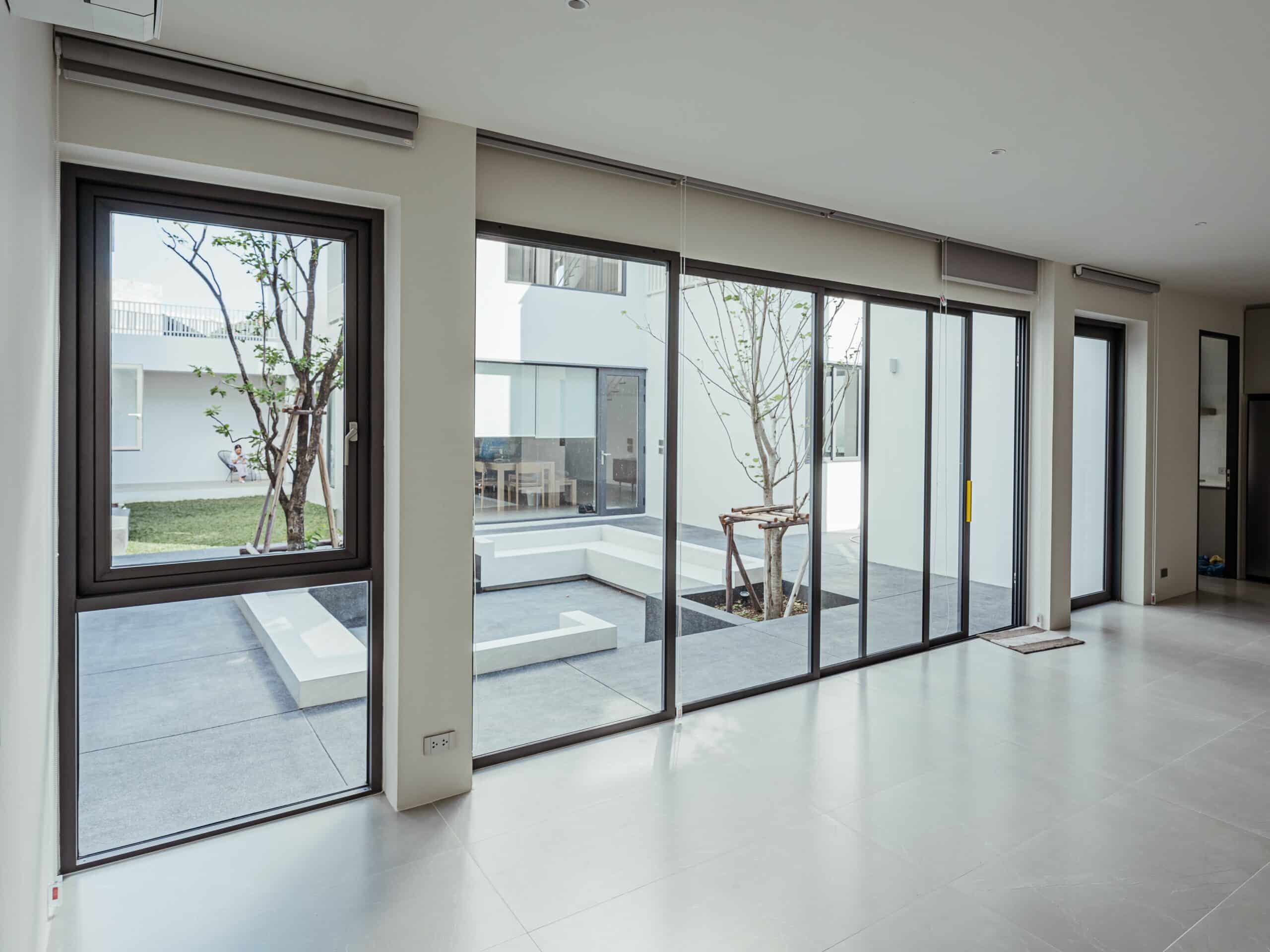 ภายในบ้าน มีการติดตั้งประตูบานเลื่อน 3 บาน ในบริเวณที่เชื่อมต่อกับระเบียง โดยข้อดีของประตูบานเลื่อน 3 บาน คือมอบพื้นที่การเปิดที่มากกว่า เมื่อเลื่อนเปิดแต่ละบานให้มาซ้อนกันที่ฝั่งใดฝั่งหนึ่งแล้ว จะมีพื้นที่เปิดมากกว่าถึง 2 ใน 3 และยังช่วยลดเส้นกรอบประตูหน้าต่างที่อาจกวนสายตาผู้พักอาศัย