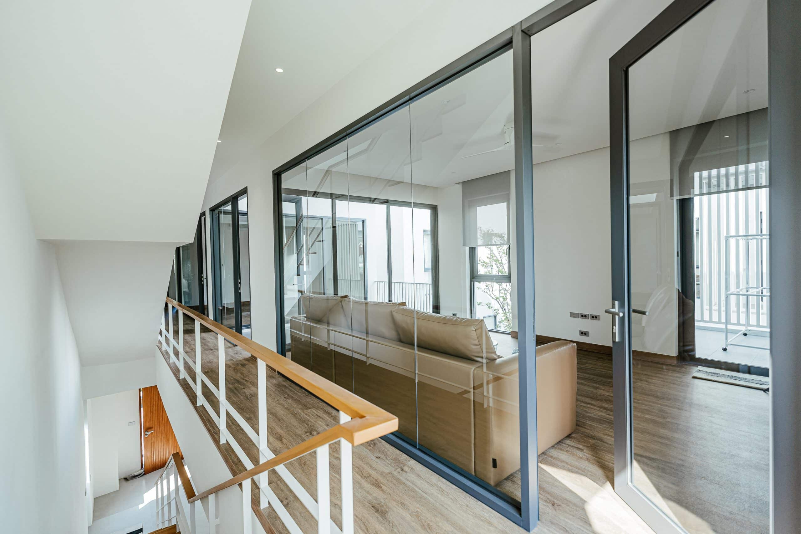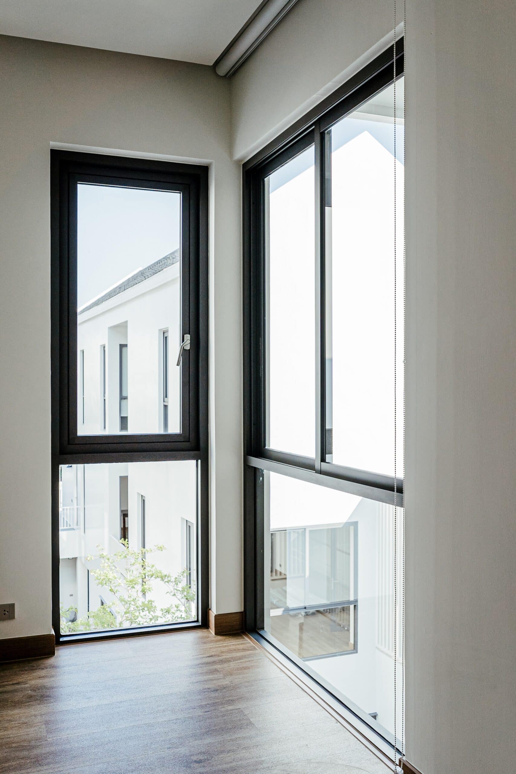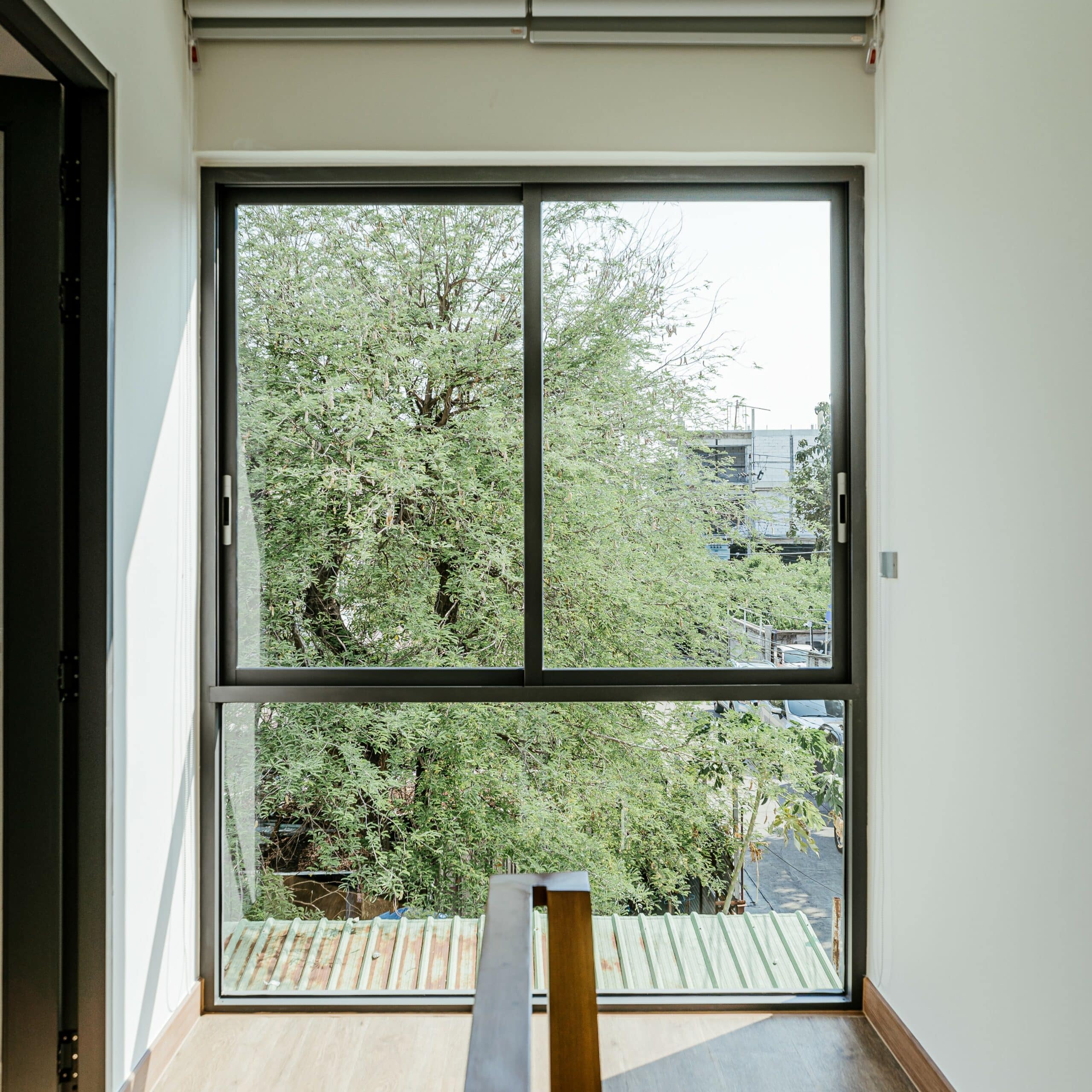 ในส่วนของหน้าต่าง มีการติดตั้งหน้าต่างหลากหลายรูปแบบ โดยบ้านหลังนี้เลือกใช้หน้าต่างบานเลื่อนสลับรุ่น X20 ที่เหมาะกับการใช้งานภายนอก เพราะทนทานในทุกสภาพอากาศ มีการออกแบบรางล่างให้ป้องกันปัญหาน้ำรั่ว และยังกันลม เสียง ฝุ่น แมลง ได้ดีกว่าบานเลื่อนชุดท้องตลาดทั่วไป โดยบริเวณที่ต้องการแสงสว่างเป็นพิเศษ เช่น โถงบันได ก็สามารถติดตั้งบานเลื่อนร่วมกับช่องแสง เพื่อให้รับแสงธรรมชาติจากภายนอกได้มากยิ่งขึ้น